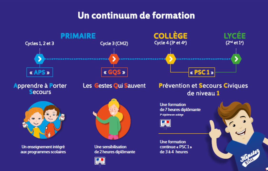 Pour répondre à cette volonté institutionnelle, l’UGSEL a mis en place un continuum de formation aux gestes de 1ers secours tout au long de la scolarité des élèves du 1er et 2nd degré :